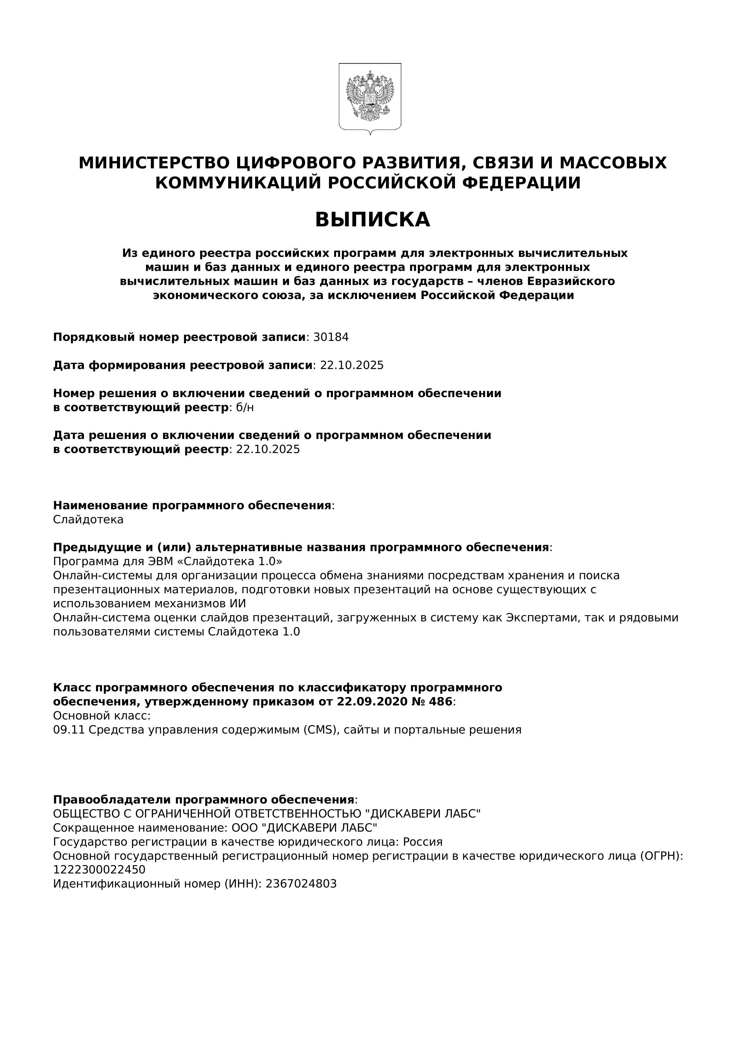 Слайдотека - интеллектуальная платформа для хранения, управления и обмена презентационными материалами - зарегистрирована в ЕРРП.